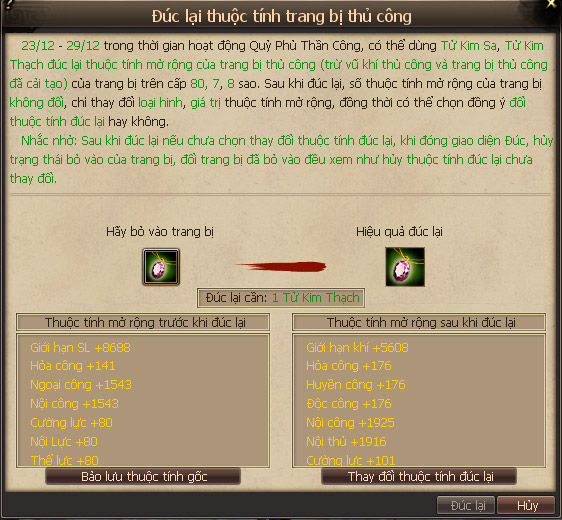 Khi đúc lại, có thể tự chọn đồng ý đổi thuộc tính mở rộng hiện có của trang bị thành thuộc tính mở rộng đúc lại hoặc bảo lưu như cũ.